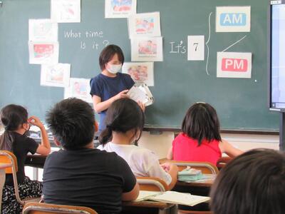 ◆4年生の外国語では、時刻を尋ね方とその答え方をやり取りしているよ。