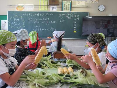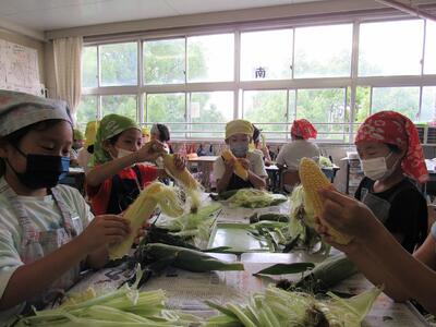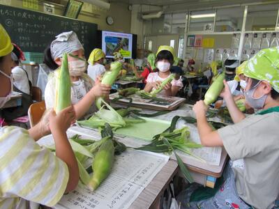 ◆朝一番から、とうもろこしの皮むきに挑戦する3年生!!