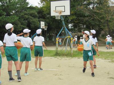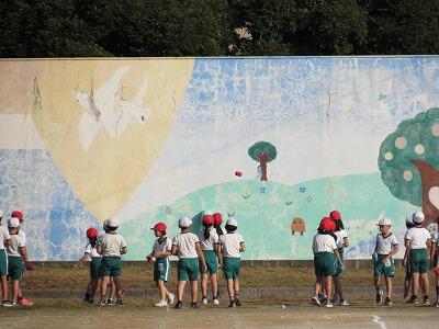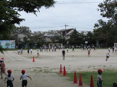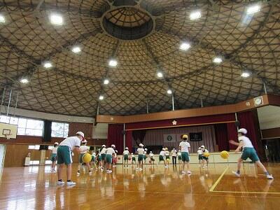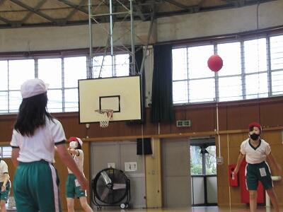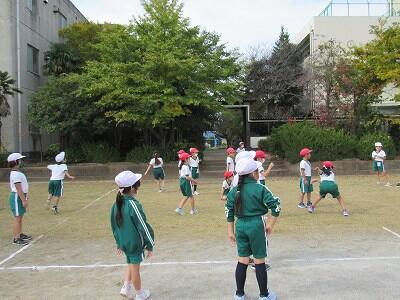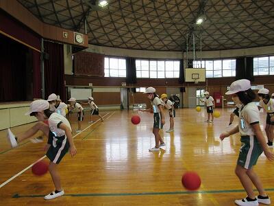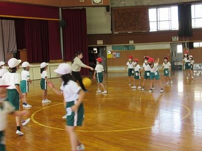 ◆1年生の2クラスが、合同でドッチボールをしているよ。