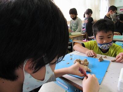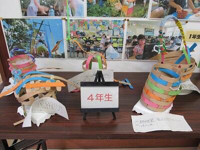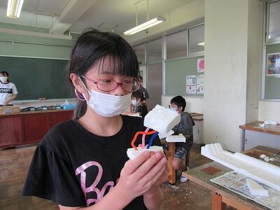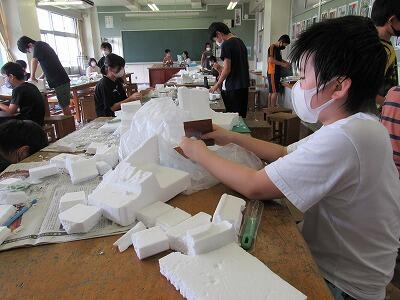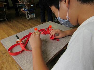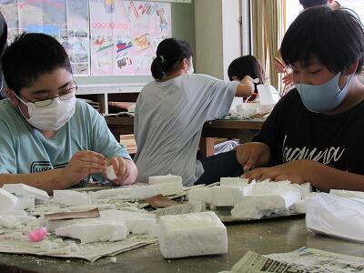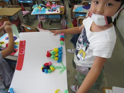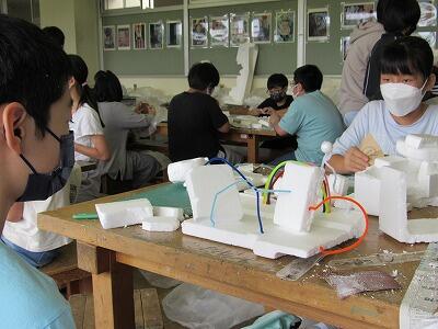 針金と発泡スチロールの立体に着色し、思い思いの表現を楽しんでいますね。