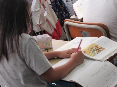 こちらでは、新しいドリルやノートに丁寧な字で名前を書いているね。
