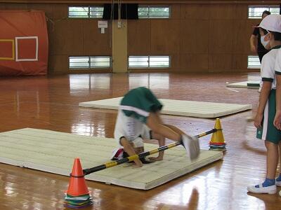 長縄が床に着いたときに中に入って片足でジャンプをしてみよう!!