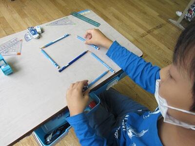 色々な平行線が書けるようになってきたよ。机の上の三角定規がまぶしく光ってますね。
