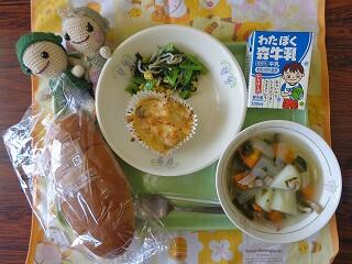 10月27日~11月9日は読書週間です。本と給食をあわせて楽しんでもらいたいと思い、図書館リストランテを実施しました。今日の給食は、角野栄子さんがかいた本「ハンバーガーぷかぷかどん」と「おばけのアッチとドラキュラスープ」に出てくる料理をイメージした献立です。