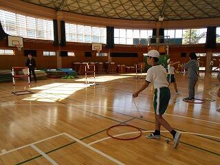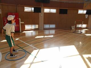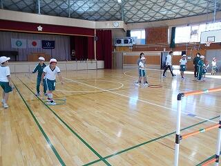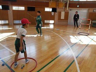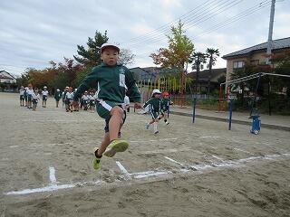 ★体育の時間、幅跳び遊びをしていました。片足踏み切り、両足着地を意識しておもいっきり跳んでいました。