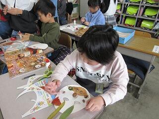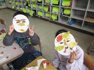 ★生活科の時間、「あきをたのしもう」の学習で、葉や実を使ったお面づくりをしていました。