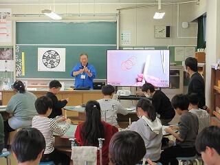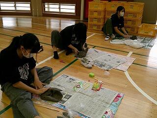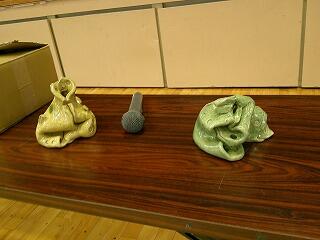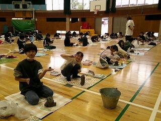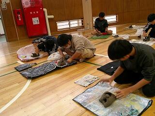 ゲストティーチャーをお招きして、一人当たり1kgを超える大きな粘土で作品作りに挑戦しました。はじめに講師の方から、手本となる作品の紹介と、作品に模様をつける方法などについて説明を受けました。