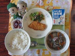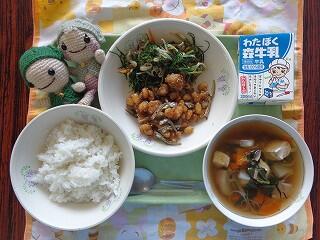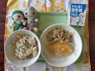 「大山おこわ」は、鳥取県の大山町周辺の郷土料理です。漢字で大きい山と書いて、「だいせん」と読みます。地元でとれたもち米や山菜などで作られます。給食の大山おこわには、鶏肉、えりんぎ、ぜんまい、油揚げが入っています。