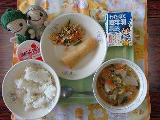 2学期の家庭科の授業で、バランスのよい献立について学習し、給食の献立を考えました。旬の食材を意識して取り入れた栄養たっぷりの献立です。春巻きの中にはさわら(魚)だけでなくチーズとねり梅を入れることで、魚の臭みを消してくれ食べやすくとてもおいしかったです。