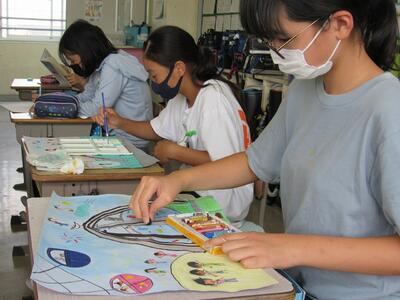 ◆6年生の図工は、公園橋と仲よくする絵を描き、いよいよ完成が近づいているよ。