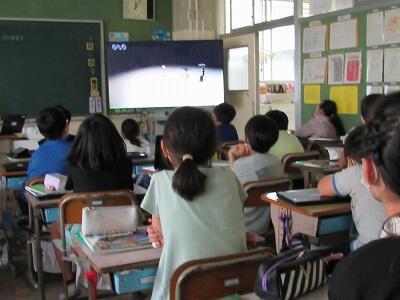 大画面での動画を見つめ、自分たちの水のかさの測り方を振り返っているね。