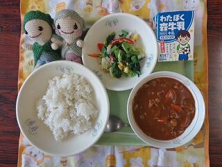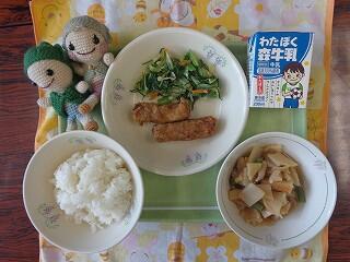 6年生が考えた献立です。みんなの苦手なナスを豚肉と甘辛な味付けで食べやすく工夫された料理と、旬の野菜をたくさん使ったバランスの良い献立です。