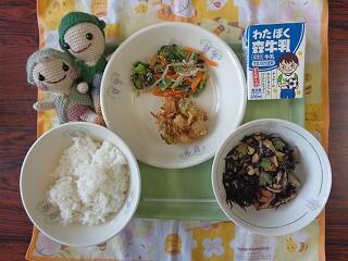 6年生が考えた料理です。金平の材料で味付けがコンソメ味というオリジナル料理です。切り干し大根も加えて、食物せんいたっぷりです。