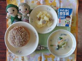 明日9月10日は十五夜で、この日の月を「中秋の名月」といいます。今日の給食はお月見献立です。お月見のときにお供えするさといもの料理や旬の果物の梨を使ったお月見梨ゼリーが出ました。