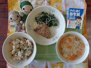 1日に早いひなまつり献立です。ちらし寿司はお祝い料理の代表で、彩りよいろいろな具が入っています。菜の花のごま和えの菜の花は、春を告げる野菜の一つです。