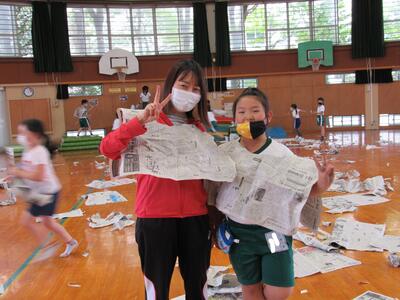 先生たちと思い思いのシャボン玉を作ります。初夏の季節感を楽しんでいます。