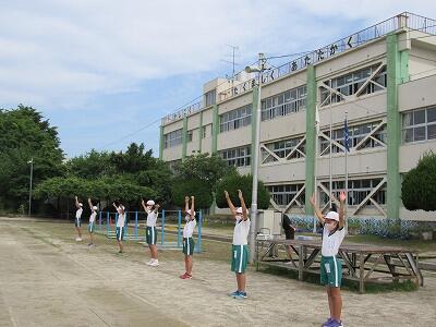 こちらの3年生も、朝礼台の先生と息を合わせたラジオ体操です。
