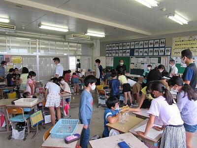 ◆5年生の理科では、先生の周りにたくさん集まっています。