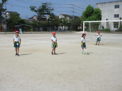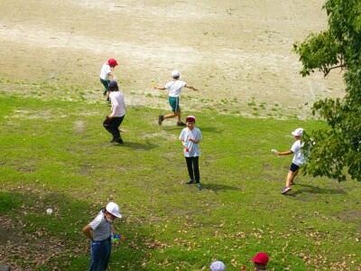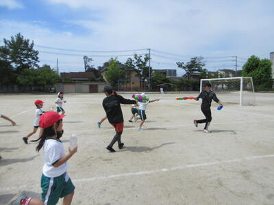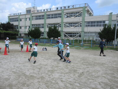 ★体育ではタグラグビーを行っていました。前にパスをしてはいけない等のルールを覚えて、トライ目指してみんな全力プレーです。