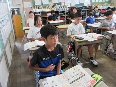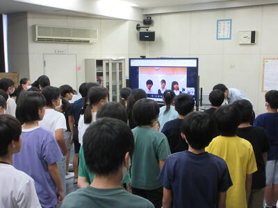 ★国歌をみんなで歌いました。音楽が流れ、みんなの歌が各教室から聞こえてきます。
