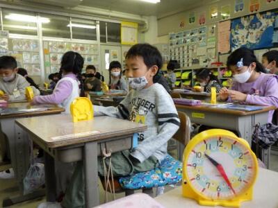 1年生 算数 投稿日時 : 2021/02/15 幸松小学校管理者 カテゴリ: 時計の針を、先生の時計と同じように合わせます。 「10時25分」です。 そのとき、2時間目の終わりのチャイムが鳴りました。 元気タイムの後に雨が降り出しました。 休み時間は教室の中で静かに過ごします。 {{options.likeCount}} {{options.likeCount}}