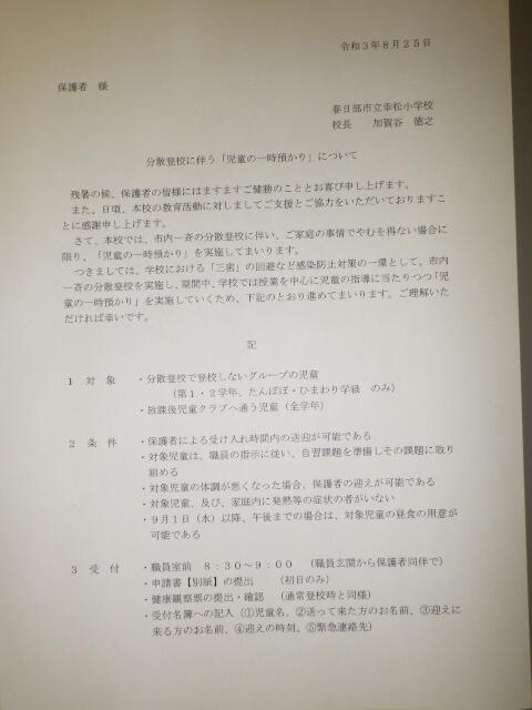 分散登校の日程等について 投稿日時 : 2021/08/25 幸松小学校管理者 カテゴリ: 幸松小トップページのファイルが開かない場合には、こちらをご覧ください。 8・9月の下校予定時刻 一時預かりについて {{options.likeCount}} {{options.likeCount}}