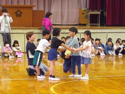 1年生を迎える会 投稿日時 : 2024/04/16 幸松小学校管理者 カテゴリ: 6年生が1年生の教室にメダルをかけ、入場です。 在校生からは、校歌や花の種をプレゼントをしました。 児童代表の言葉や校長先生の話をもらいました。 1年生もお礼の言葉を言うことができました。 {{options.likeCount}} {{options.likeCount}}
