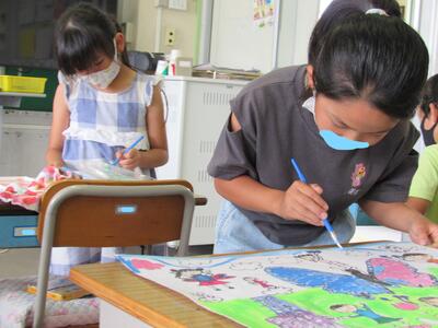 ◆6年生の図工は、公園橋と仲よくする絵を描き、いよいよ完成が近づいているよ。