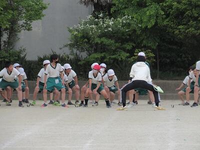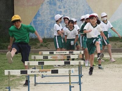 走り方やひざの上げ方を練習する走り幅跳びのグループ。