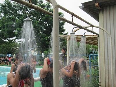◆雨が強くなってきたので、途中でプールから上がってきた3年生。