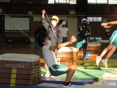 ◆体育館では、跳び箱で台上前転などにチャレンジする6年生たちがいるよ。