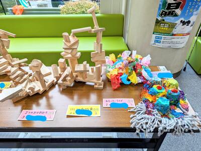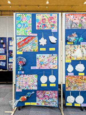 近隣の牛島小、小渕小、東中、特別支援学校の皆さんの作品もたくさんあり、会場が華やかに彩られているよ。