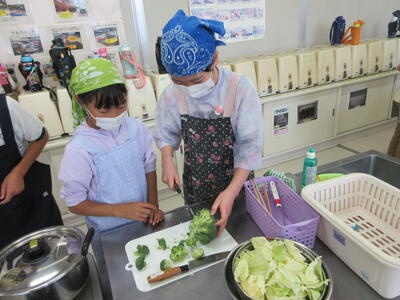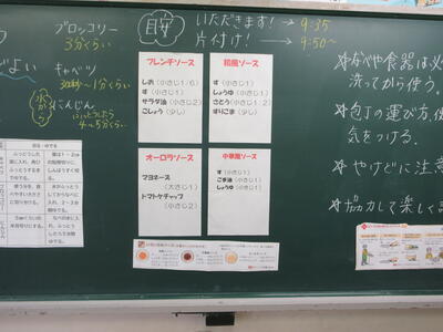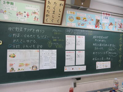 ★調理実習でサラダをつくっていました。家庭科の学習がスタートしてお茶の入れ方実習を最初に行い、だんだん実習内容がバージョンアップしてきました。今日はゆで野菜サラダをつくっていました。みんなとても意欲的に取り組んでいました。