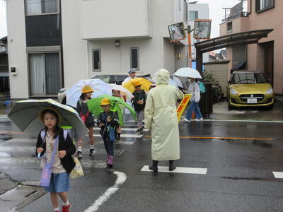 交通指導員さん、見守りボランティアのみなさん、保護者のみなさん、雨の中の見守りありがとうございました。
