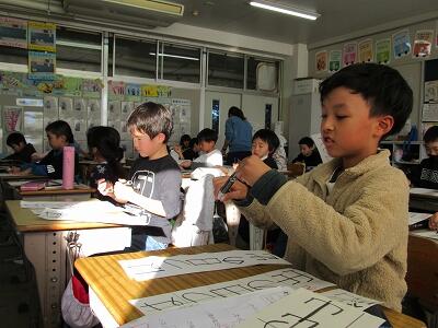 ◆2年生は、フェルトペンを使って書きぞめにチャレンジ中!!