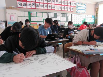 ◆6年生の図工は、「時間と空間を越えて」様々なことを想像しながら表現しているよ。