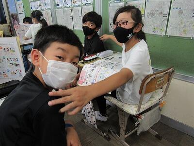 ICT専門員さんの分かりやすい説明を聞いて、友達と助け合いながら進めていっていますね。