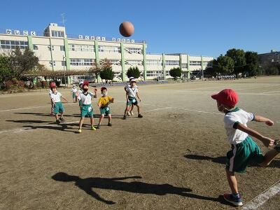 ◆1年生は、さっきまで長なわをしていたと思ったら、ドッジボールが始まっているよ。