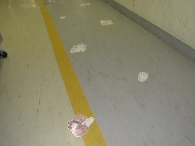 1年生の歩幅を測り、それに合わせた足跡ステッカーを貼り付けているよ。