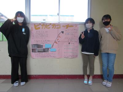5時間目、1階昇降口付近には、2組2班「ピカピカコーナー作成委員会」が活動中。