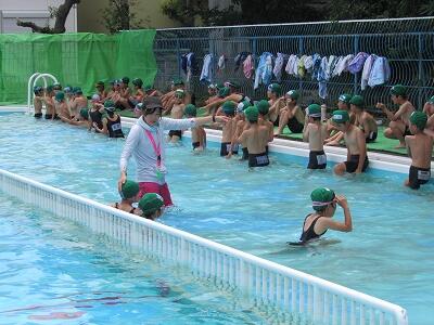 ◆2年生は、水面に顔をつけて、バタ足に挑戦しているよ。