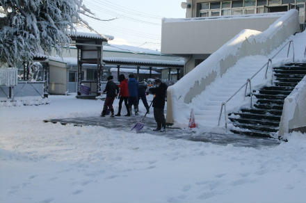 幸松っ子たちの登校に合わせて、安全確保のため、教職員による雪かきが始まりました。