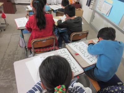 2年生はフェルトペンで「はつ日の出」という字を書きます。