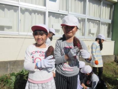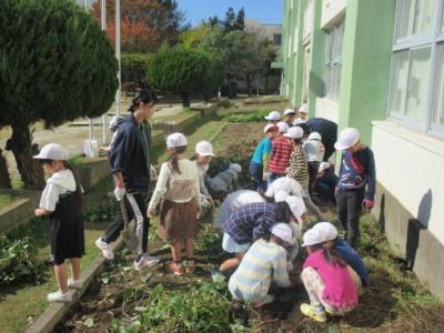 園芸委員会。職員玄関のプランターの花の手入れをします。