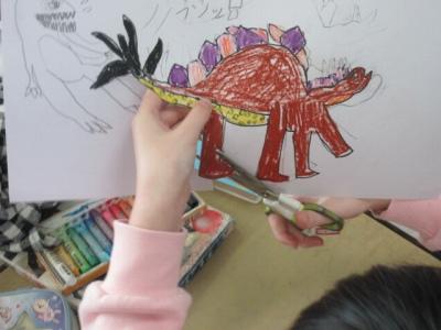 恐竜のお面をつけた3年生。「きょうりゅうとチャチャチャ」を歌いました。
