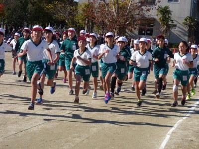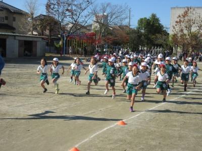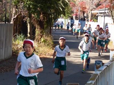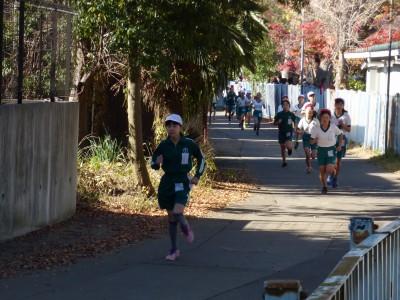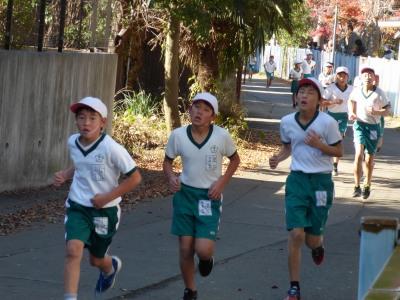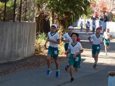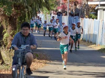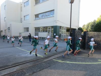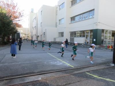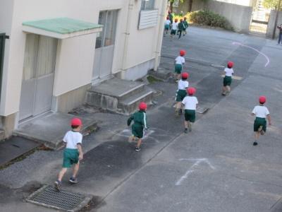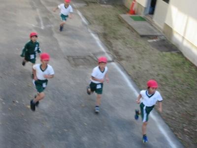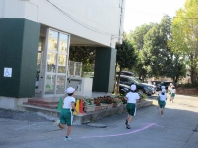 トラックから抜け出し、昇降口の脇を走り抜けます。