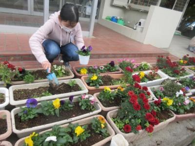 昼休み、園芸委員の児童が職員玄関前のプランターにパンジーの苗を植えてくれました。