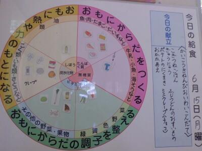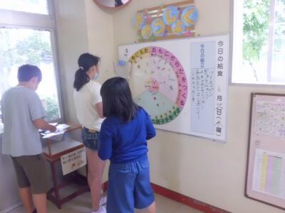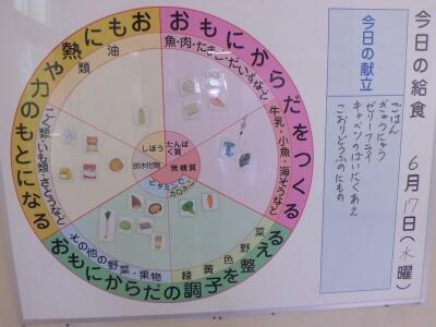 給食委員の児童が、使われている食材を6つの食品群に分けてくれます。