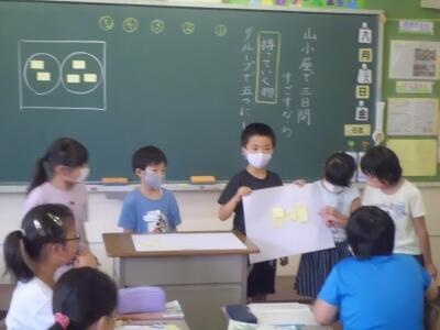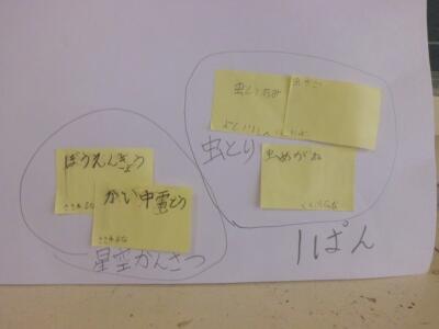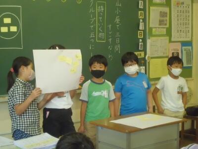 山小屋で3日間すごすなら何を持っていったらよいかをグループで話し合いました。