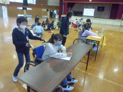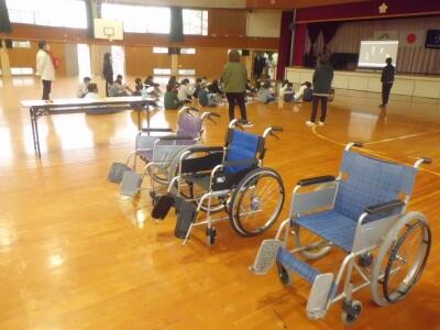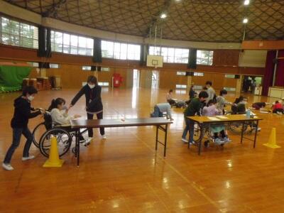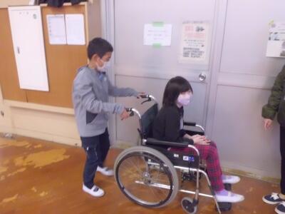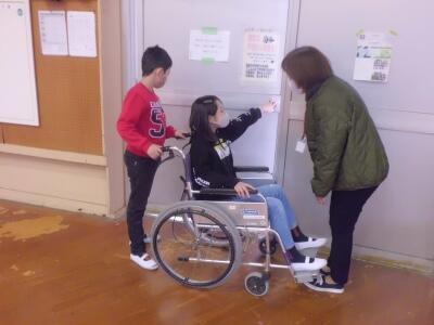 車いすボランティアの皆様にご指導いただき、順番に車いすに乗ったり押したりしてみました。